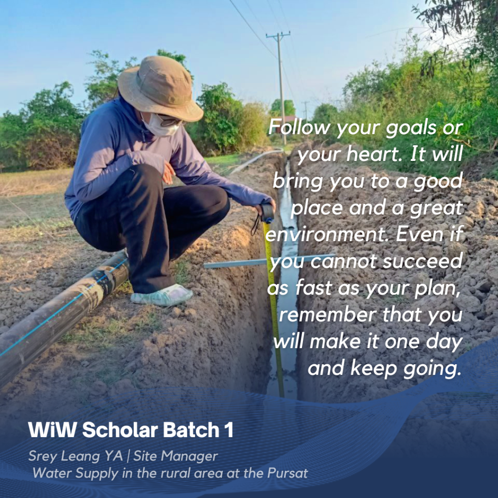 Now I am working on water supply in the rural area of Pursat, helping people in this location use clean water in their daily lives. I am working on water treatment plant and pipeline management installation at the site. I graduated with a master’s degree in Water and Environmental Engineering. As for the challenges, it was difficult to find direction and internships during my studies.